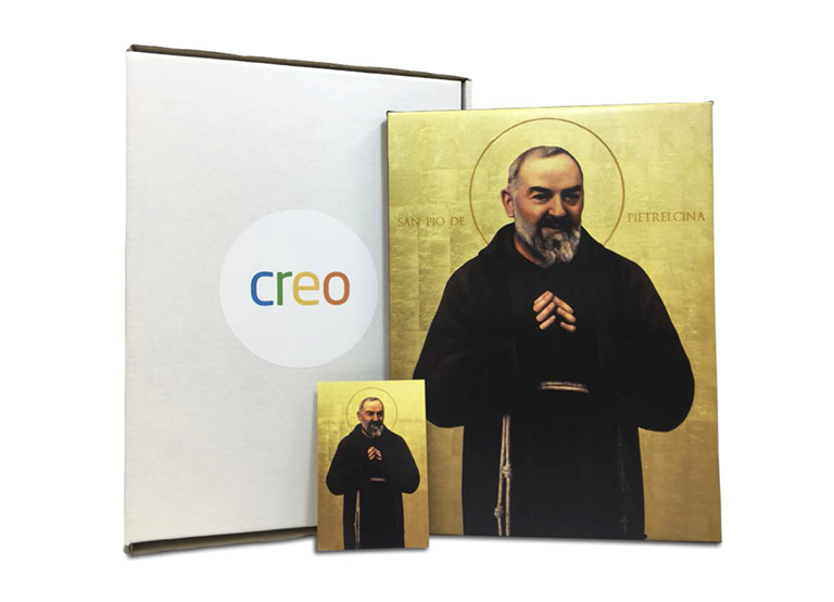 Lienzo de tela montado a mano sobre bastidor de madera. Impresión de tinta Epson con garantía de 50 años y con un barniz de protección y acabado de poliuretano al agua. Es la reproducción de un icono pintado a mano, presentado en caja con una oración e información de la artista y su ubicación.